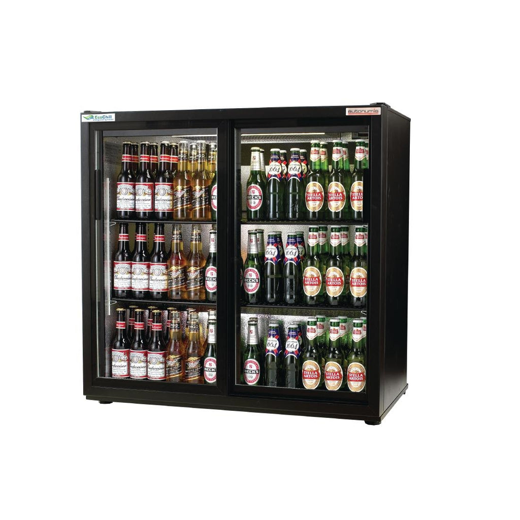 Der Autonumis EcoChill-Flaschenkühler mit Schiebetür und Doppeltür in Schwarz wurde für eine maximale Kapazität von 240 330-ml-Flaschen entwickelt und ist ein unglaublich effizienter und attraktiver Bierkühlschrank mit vollständig verstellbaren Regalen und effizienter LED-Beleuchtung. Der EcoChill-Barkühlschrank ist ideal für die Vermarktung von Bier, Apfelwein und Erfrischungsgetränken und verfügt über eine fortschrittliche Kühltechnologie, die dafür sorgt, dass die Flaschen schnell und effizient gekühlt werden und dabei auch dann noch kühl bleiben, wenn die Türen in belebten Bars und Pubs regelmäßig geöffnet sind. Nutzinhalt 252 Liter.