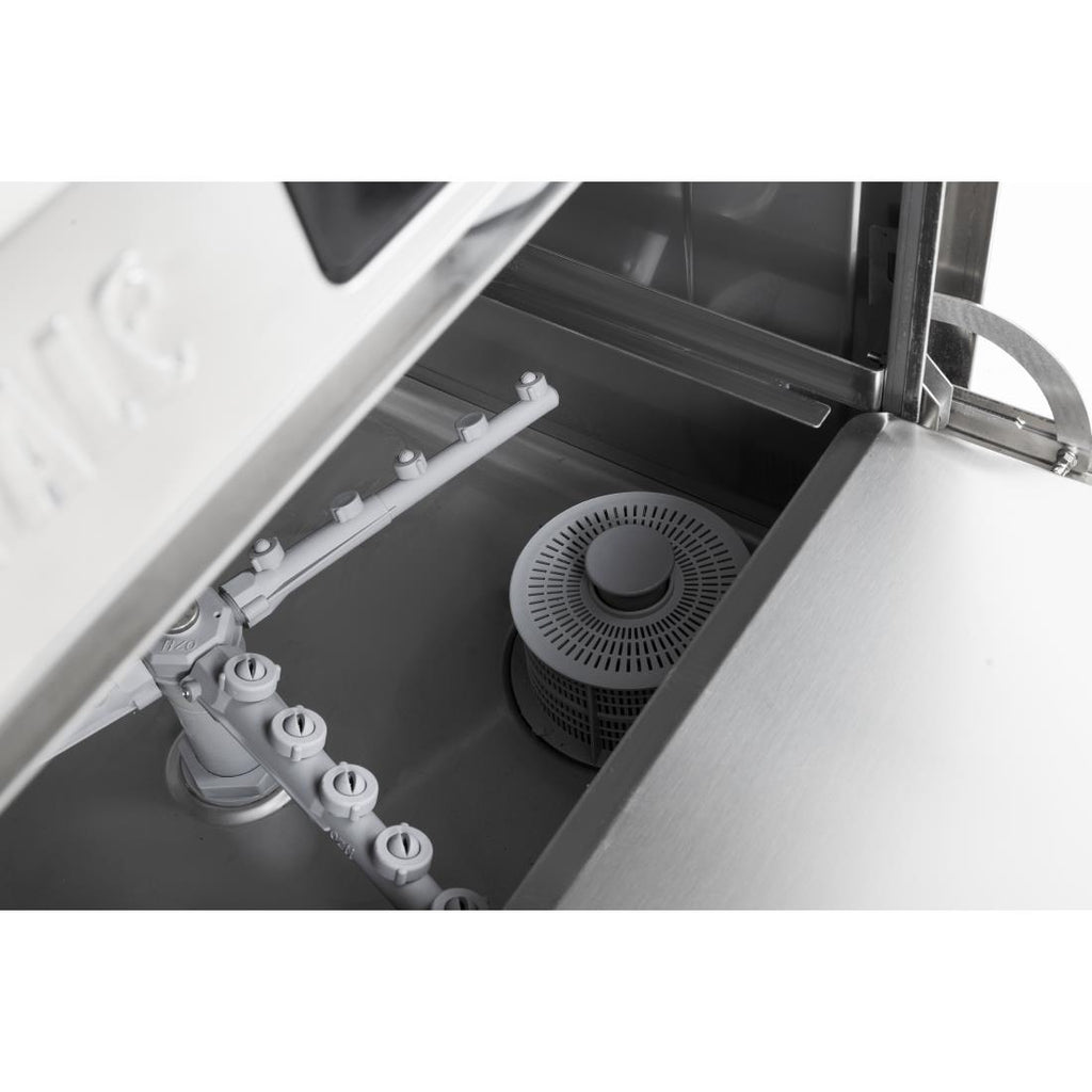 It's fast too — able to operate at up to 35 cycles per hour on the fastest cycle (maximum cycles achieved may vary depending on power rating and incoming water temperature). You can quickly turn around dishes when demand is high. The machine itself is easy to clean, with strong stainless steel construction and a simple wipe-clean digital panel.