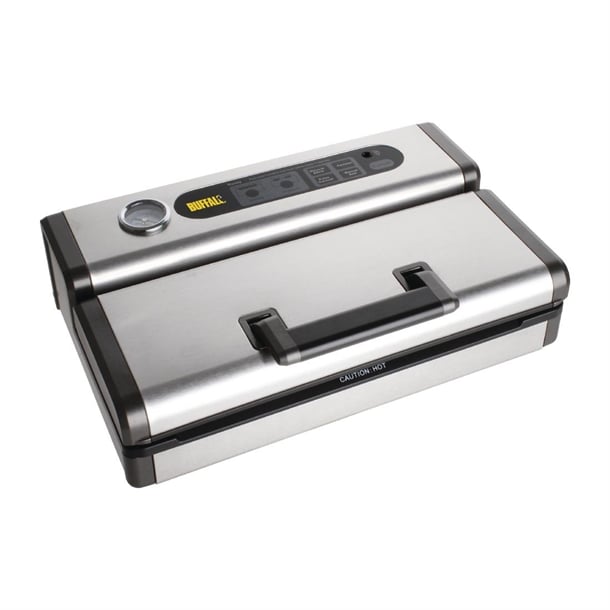 Vakuumverpackungsmaschine aus Edelstahl mit Vakuummeteranzeige. Ideal, um die Haltbarkeit von Lebensmitteln zu verlängern. Bereiten Sie Lebensmittel im Voraus für den Verzehr in Stoßzeiten vor. Nicht für Flüssigkeiten geeignet. Zur Verwendung mit Vakuumbeuteln oder -rollen mit Vogue-Prägung. Nur zur Verwendung mit geprägten Vakuumbeuteln.