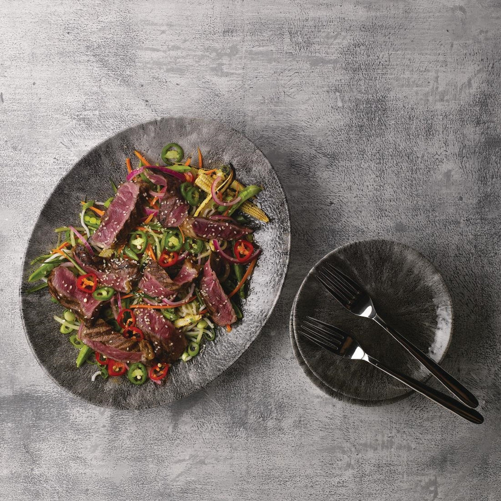 Quarzschwarzes Geschirr mit einem auffälligen Sonnenschliffmuster, das den Blick auf die Mitte lenkt und Ihr Essen perfekt umrahmt. Super verglast, mit Unterglasurmuster für langanhaltende Ergebnisse. Mikrowellen- und spülmaschinenfest. Verkauft in Packungen mit 12 Stück.
