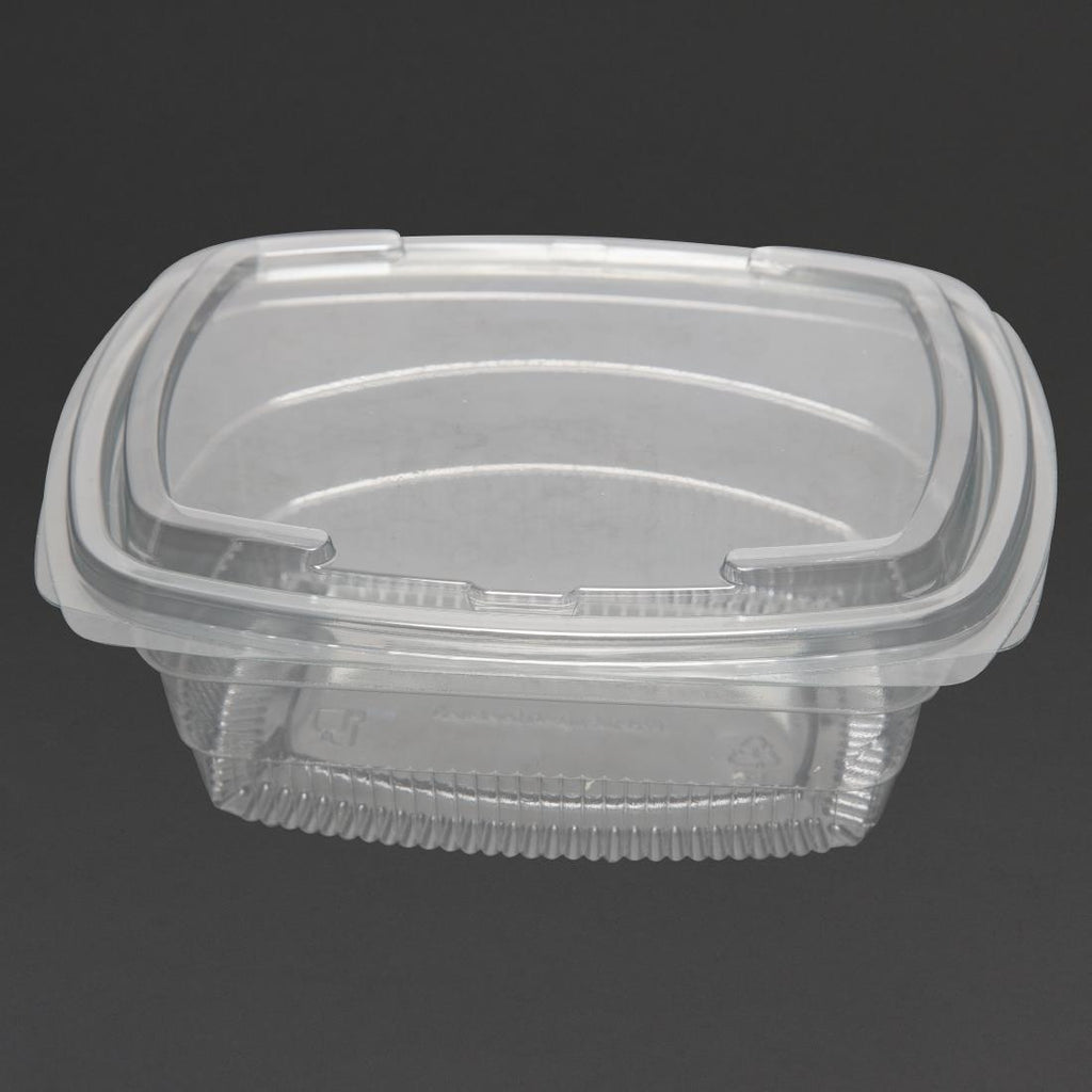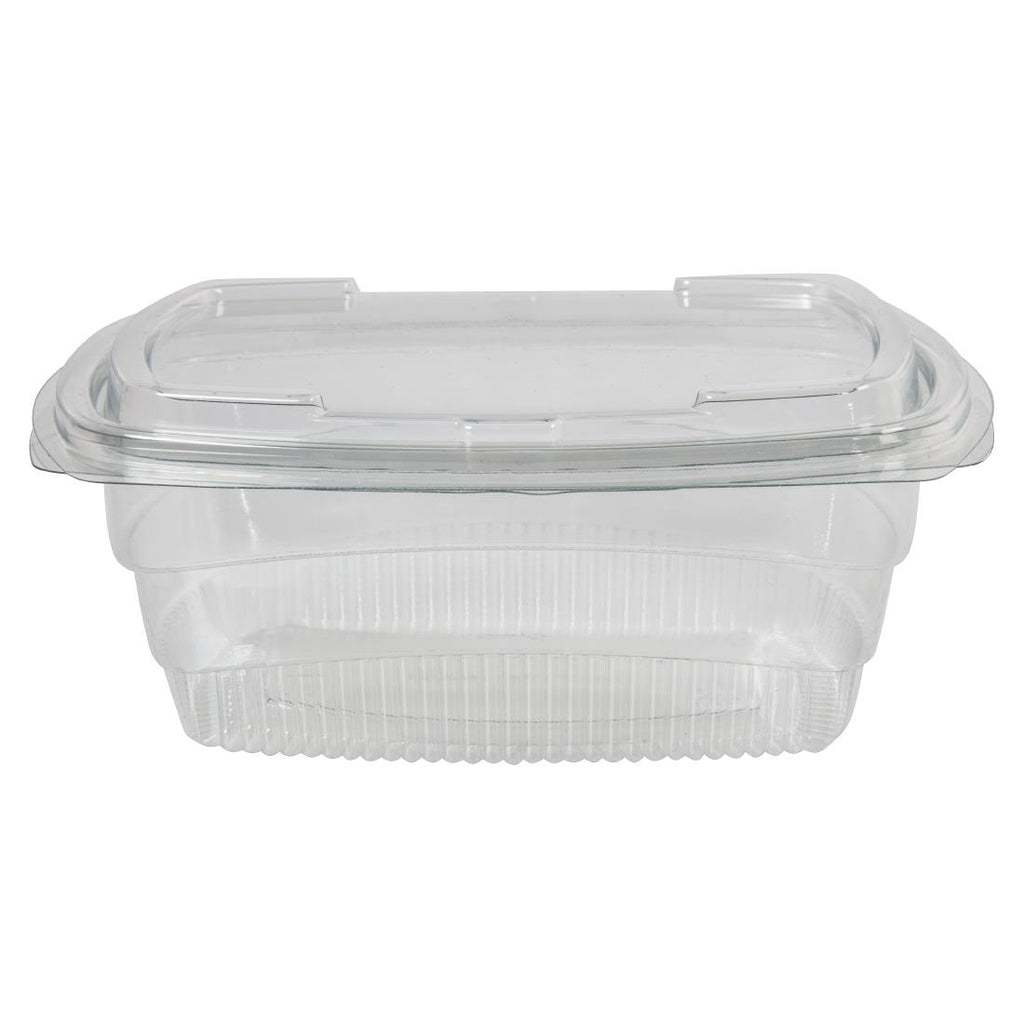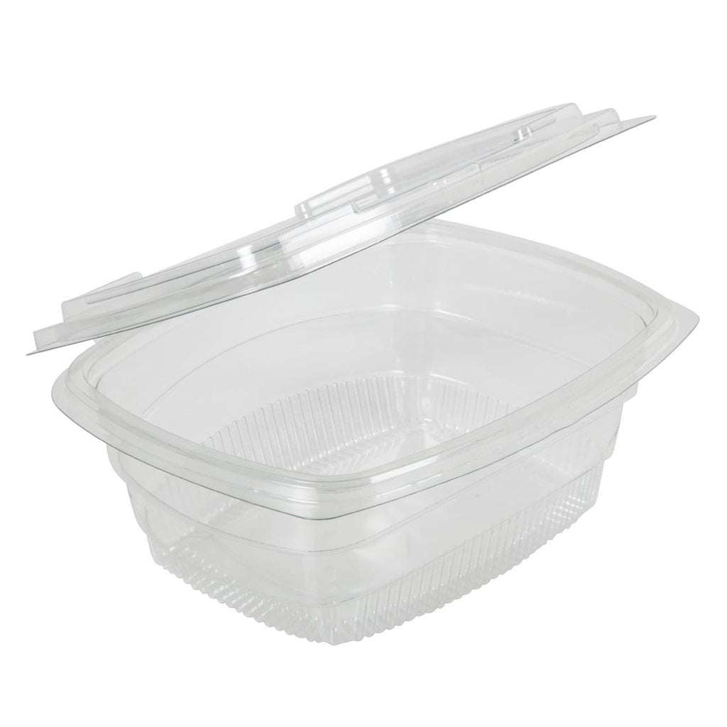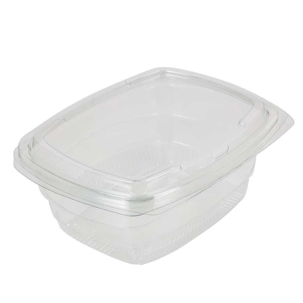 Eine Packung mit 300 x 35 Unzen stilvollen, praktischen und erschwinglichen Feinkostschalen, die zu 90 % aus recyceltem PET bestehen. Ideal zum Servieren von Salaten, Nudelgerichten und Obst.