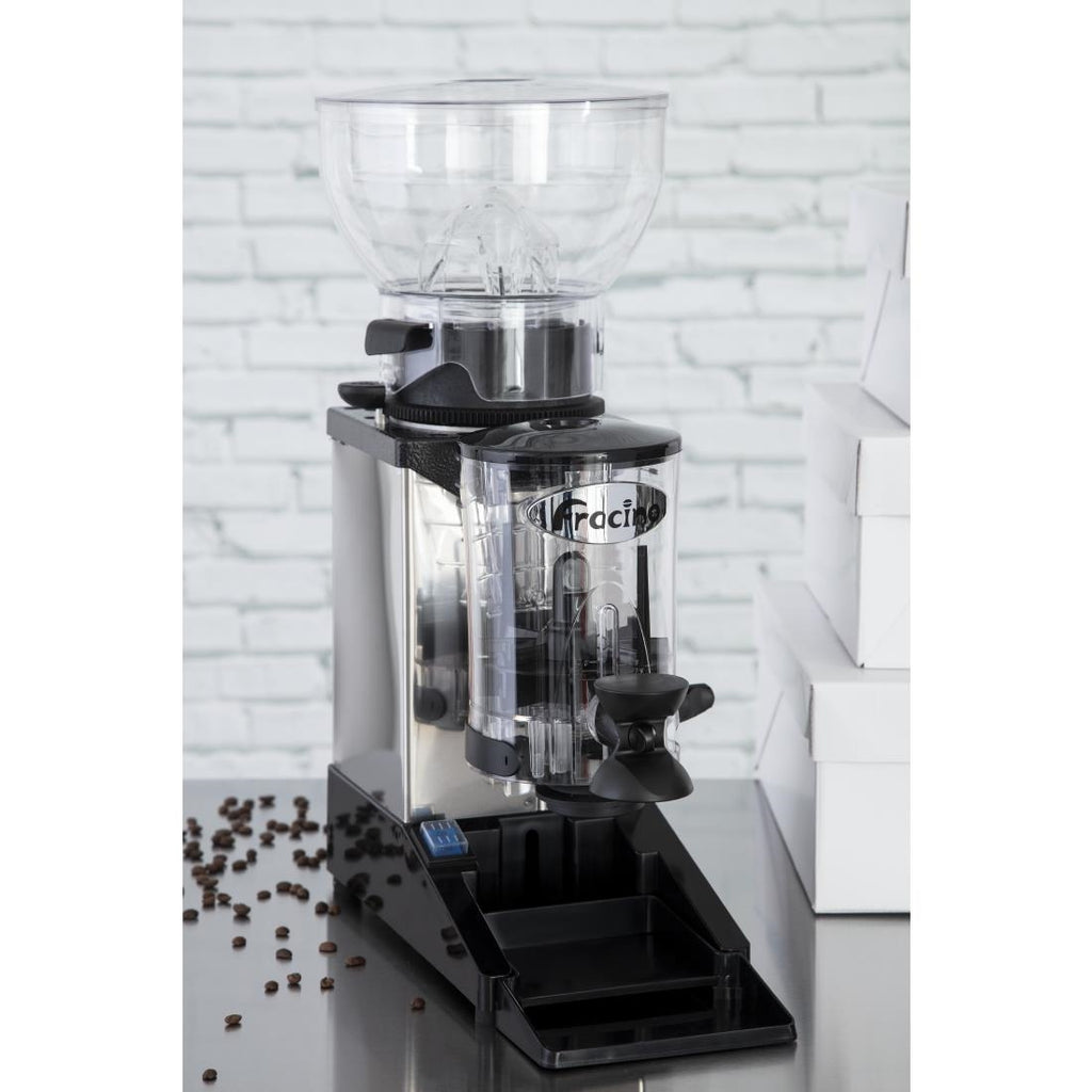 Das Modell T verfügt über ein poliertes Edelstahlgehäuse und ist ideal für die Kaffeemaschinen der Fracino-Reihe geeignet. Die Bedienung erfolgt manuell über einen Ein-/Ausschalter. Die Ausgabe des Kaffees in den Filterhalter erfolgt über einen Kipphebelmechanismus. Das Gewicht des gemahlenen Kaffees kann zwischen 5 und 12 Gramm eingestellt werden und die Ausgabekapazität beträgt 600 Gramm gemahlenen Kaffee.