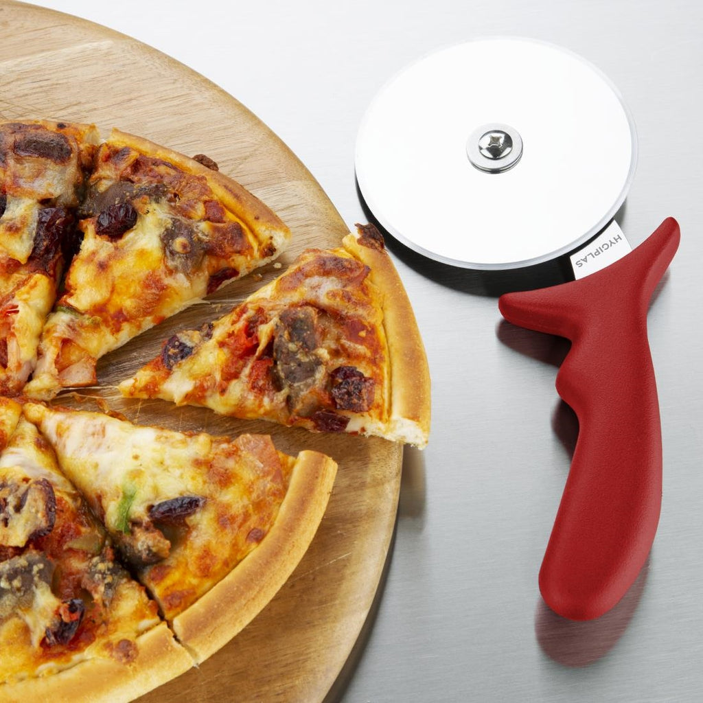 Rotes Pizzaschneiderrad aus Edelstahl.