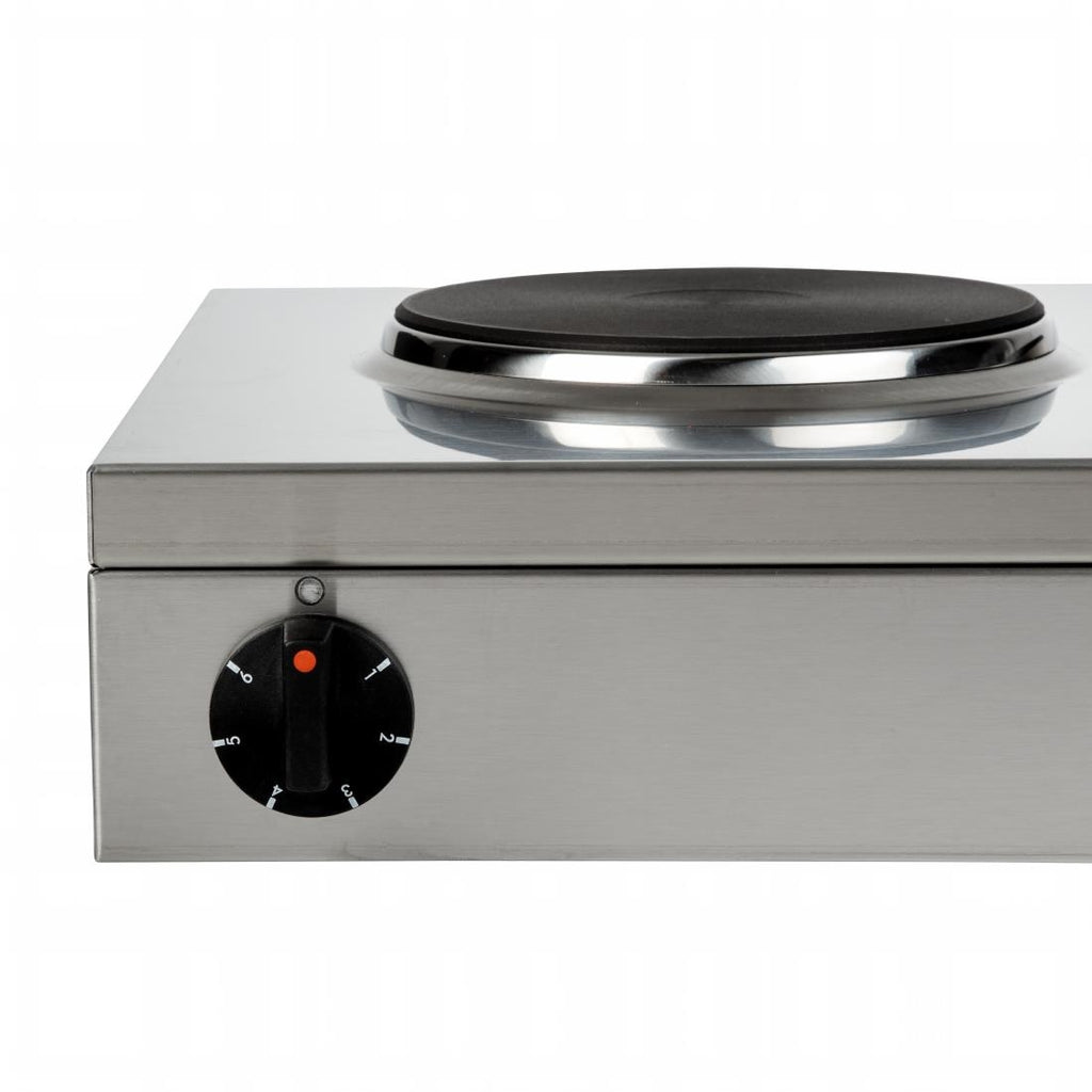 Ein Arbeitsplattengerät mit zwei Kochringen und einem kompakten, flachen Design, das eine angenehme Arbeitshöhe bietet, wenn es auf einer typischen 900 mm hohen Arbeitsplatte montiert wird. Die Kochplatte ist mit einer variablen Hitzeregelung und einer thermischen Abschaltung ausgestattet, um zu verhindern, dass die Pfannen trocken kochen oder weiter aufheizen, wenn die Pfanne entfernt wird, und um sicherzustellen, dass die Kochplatten so sicher wie möglich sind. Dies verlängert zudem die Lebensdauer des Elements und sorgt für maximale Energieeffizienz. Versiegelte Kochplatten und ein Edelstahlgehäuse ermöglichen eine einfache Reinigung des Kochfelds.