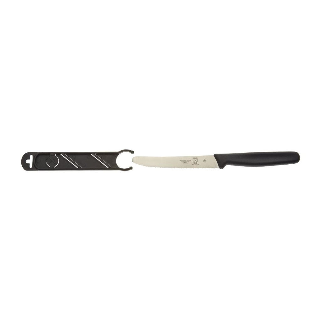 Verwenden Sie dieses Mercer Culinary M33932B 4 1/4" Schäl-/Barmesser mit gezahnter, abgerundeter Spitze und Messerschutz, um die perfekte Garnitur für Ihren gemixten Cocktail zu kreieren. Dieses Messer ist die perfekte Ergänzung für den Werkzeugkasten jedes Barkeepers und wurde zum mühelosen Schneiden von Obst, Kräutern und Gemüse entwickelt zum Garnieren einer Bloody Mary, eines Moskauer Maultiers, eines Daiquiri oder Ihres Lieblingsgetränks. Seine abgerundete Spitze schützt weiche Innenseiten, während die gezackte Kante leicht durch harte Schalen schneidet. Verwenden Sie es in Ihrem Restaurant zum Schneiden von Äpfeln oder Orangen oder im Vorfeld von Catering-Events Bereiten Sie Erdbeeren oder Zitronenspalten vor.