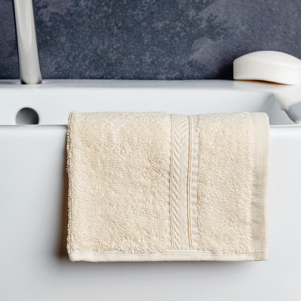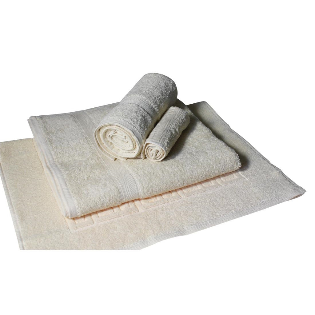 Hochwertiges Badetuchpaket, das speziell für Studenten entwickelt wurde. Diese Serie cremefarbener Handtücher wird mit einem Waschlappen, einem Handtuch, einem Badetuch und einer Badematte geliefert.