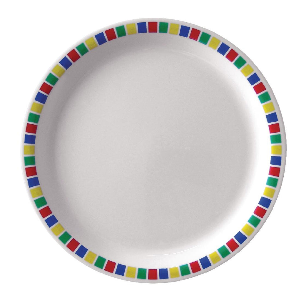 Als hygienische und langlebige Alternative zu Porzellan sind unsere Teller aus der Melamin-Fairground-Reihe von Olympia Kristallon das perfekte Geschirr für den Einsatz in Schulen, Pflegeheimen und anderen Einrichtungen. Melamin ist ein langlebiger, kratz- und splitterfester Kunststoff, der leicht ist, und diese Serie verfügt über einen bunt gemusterten Rand.