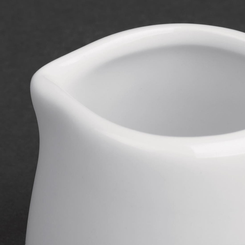 Hochwertige, reinweiße Milch- und Sahnekännchen aus Porzellan von Olympia, ideal für Hotels und B&Bs. Diese eleganten Krüge werden in verschiedenen Fassungsvermögen verkauft und sind alle mit verstärkten Rollkanten für Splitterfestigkeit und Langlebigkeit ausgestattet.