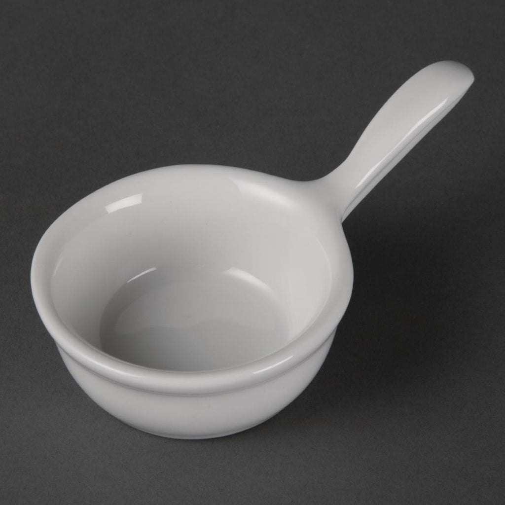 Hochwertiges Porzellan von Olympia für Ihre täglichen Catering-Bedürfnisse. Diese Schüsseln mit pfannenförmigem Griff verfügen über verstärkte, gerollte Kanten und sind vollständig verglast, um Splitterfestigkeit zu gewährleisten – das perfekte Geschirr für Vorspeisen.
