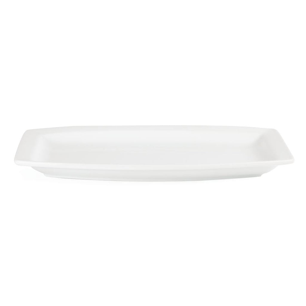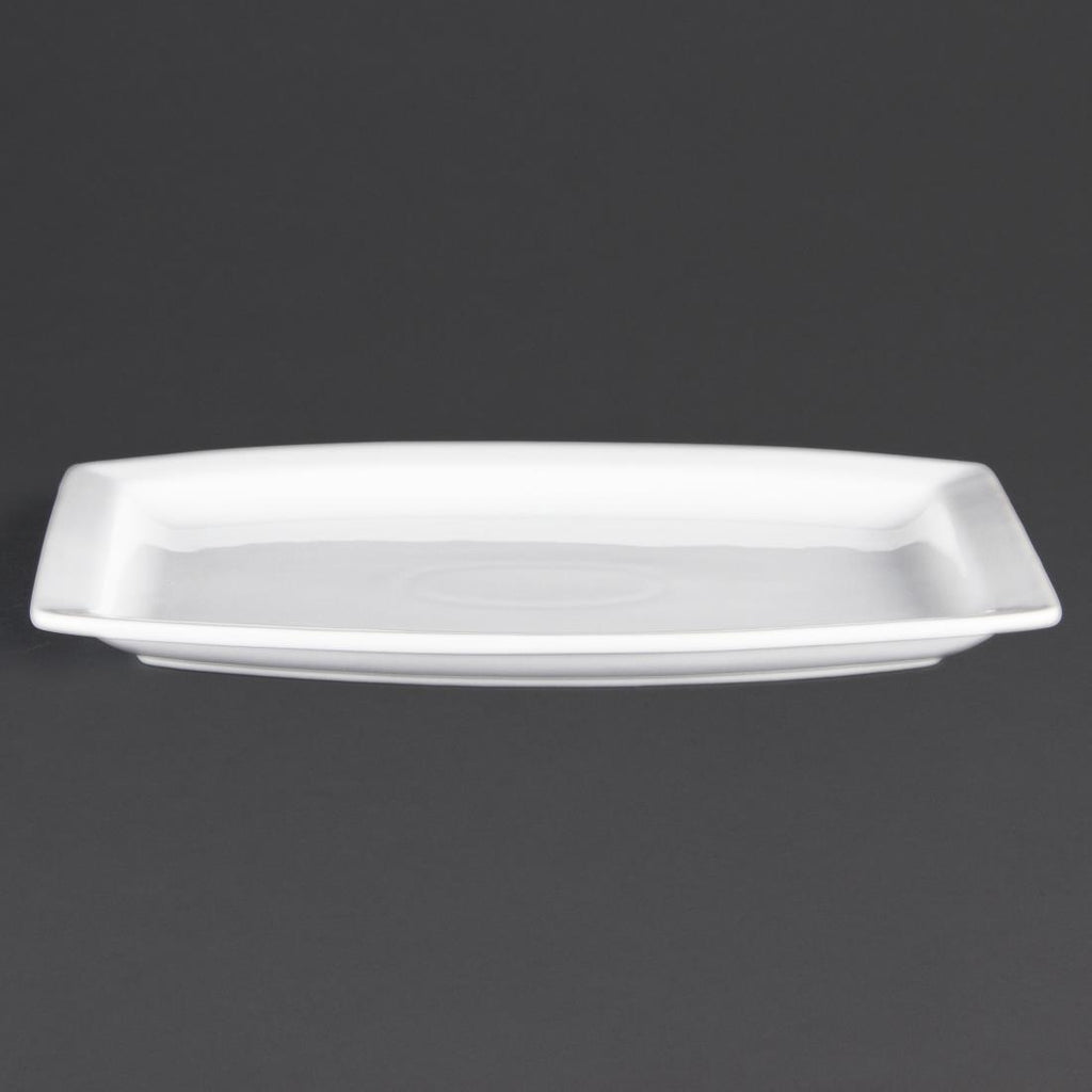 Hochwertige, strapazierfähige rechteckige Teller aus reinweißem Porzellan von Olympia mit dem zusätzlichen Vorteil der Stapelbarkeit und verstärkten Rollkanten für Splitterfestigkeit.