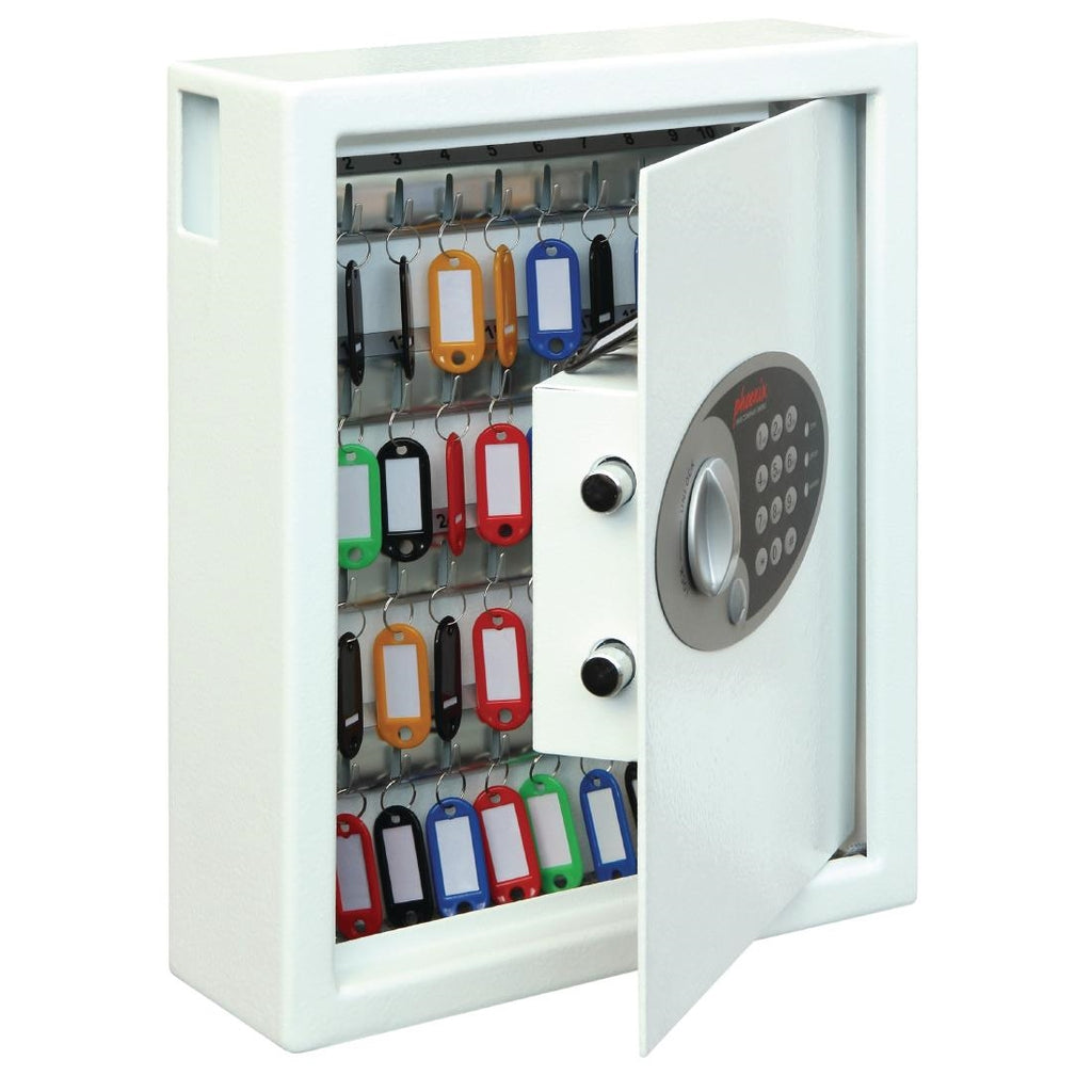 Robuster elektronischer Tresor mit Einwurfschlitzen, so dass Schlüssel hinterlegt werden können, ohne den Tresor öffnen zu müssen. Lieferung mit Schlüsselringen und farbigen Anhängern.