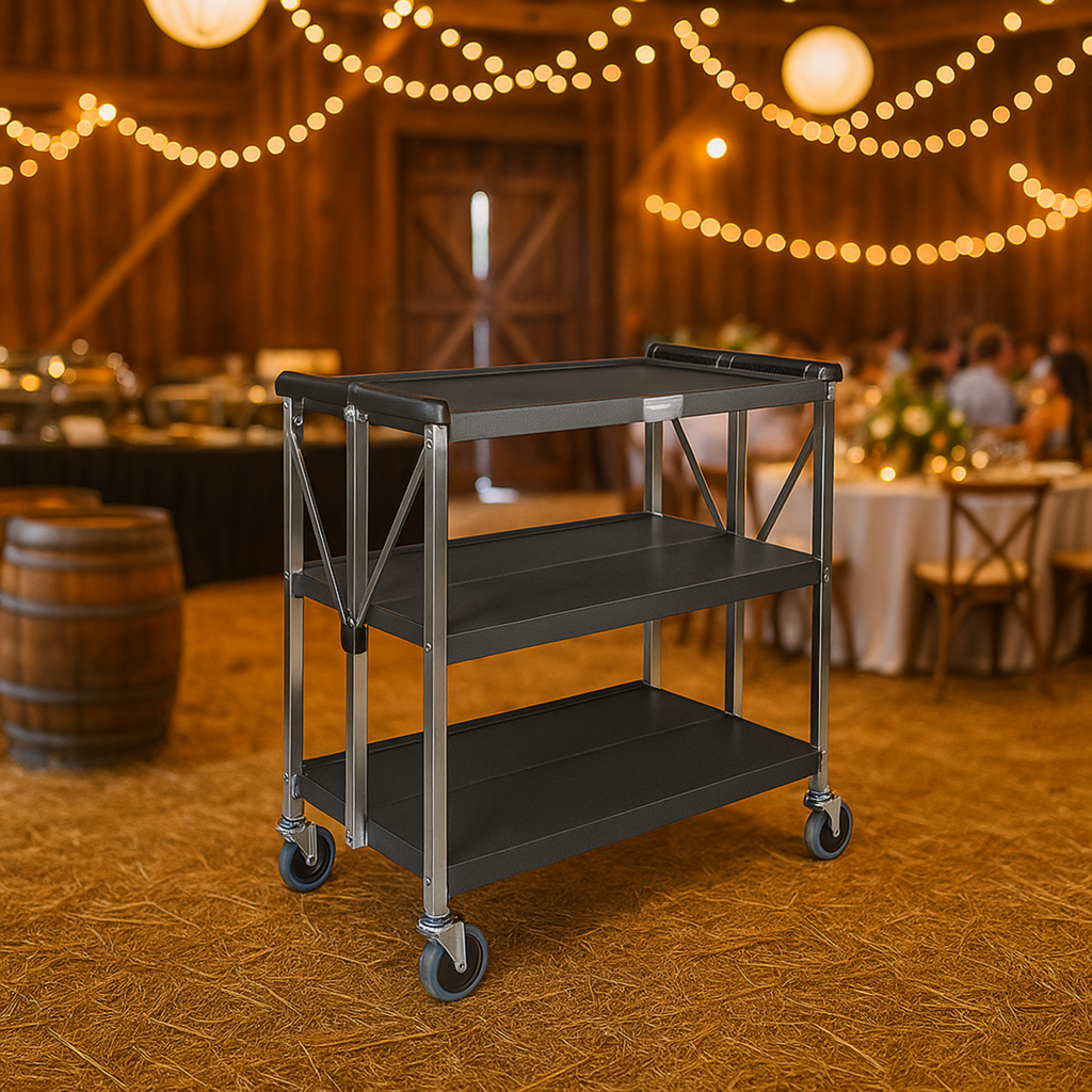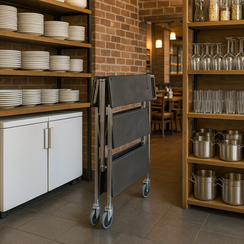 The Foldable Service Trolley is designed to maximise efficiency in busy food service environments while saving storage space. Crafted with a robust stainless steel frame, it offers durability and strength, supporting a total load capacity of 150 kg. The spacious three-tier design provides ample room for transporting supplies with ease. The foldable design allows it to collapse easily in half using a safety latch for compact storage when not in use. Whether for service, clearing, or supply transport, this trolley delivers reliable performance with a thoughtful, space-saving design.