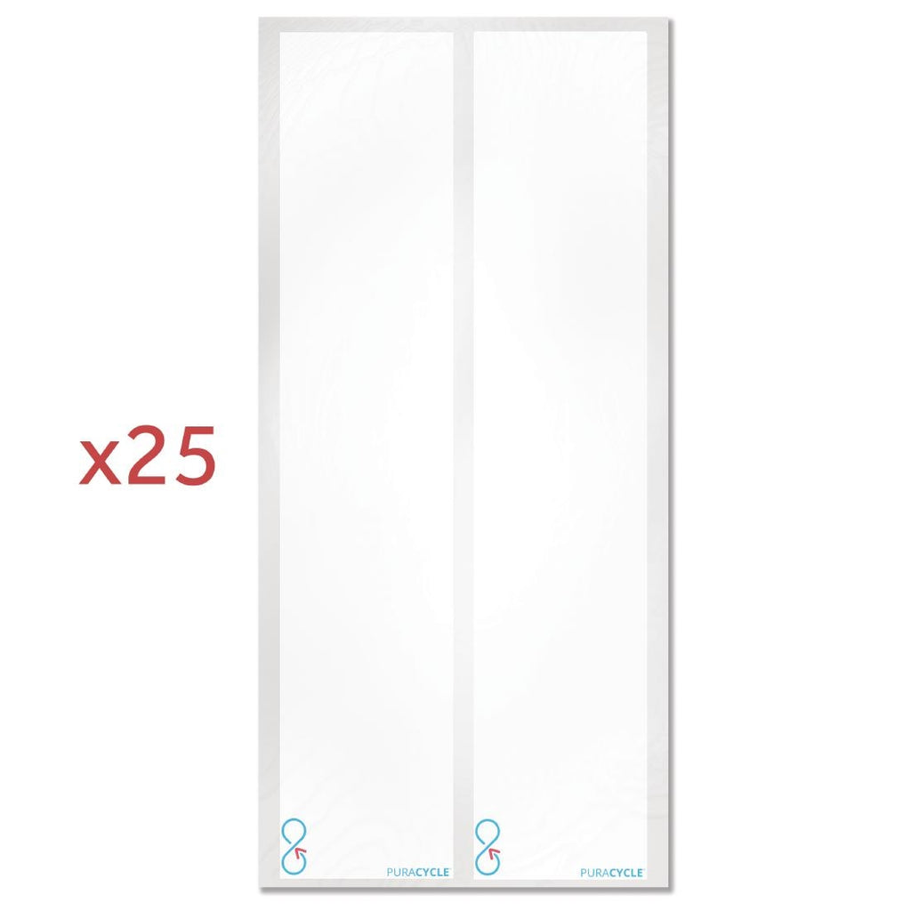 Eine Packung mit 25 wiederverwendbaren Blanko-Flaschenetiketten von Puracycle, 3 Permanentmarkern und 2 Bambus-Reinigungstüchern.