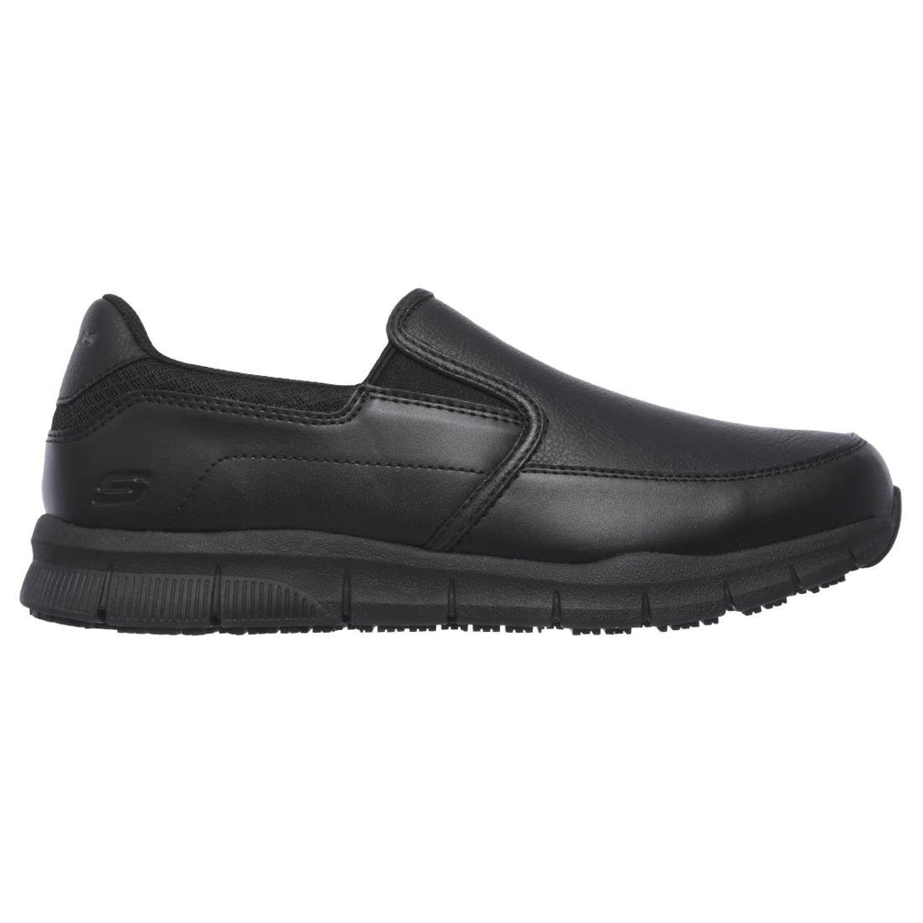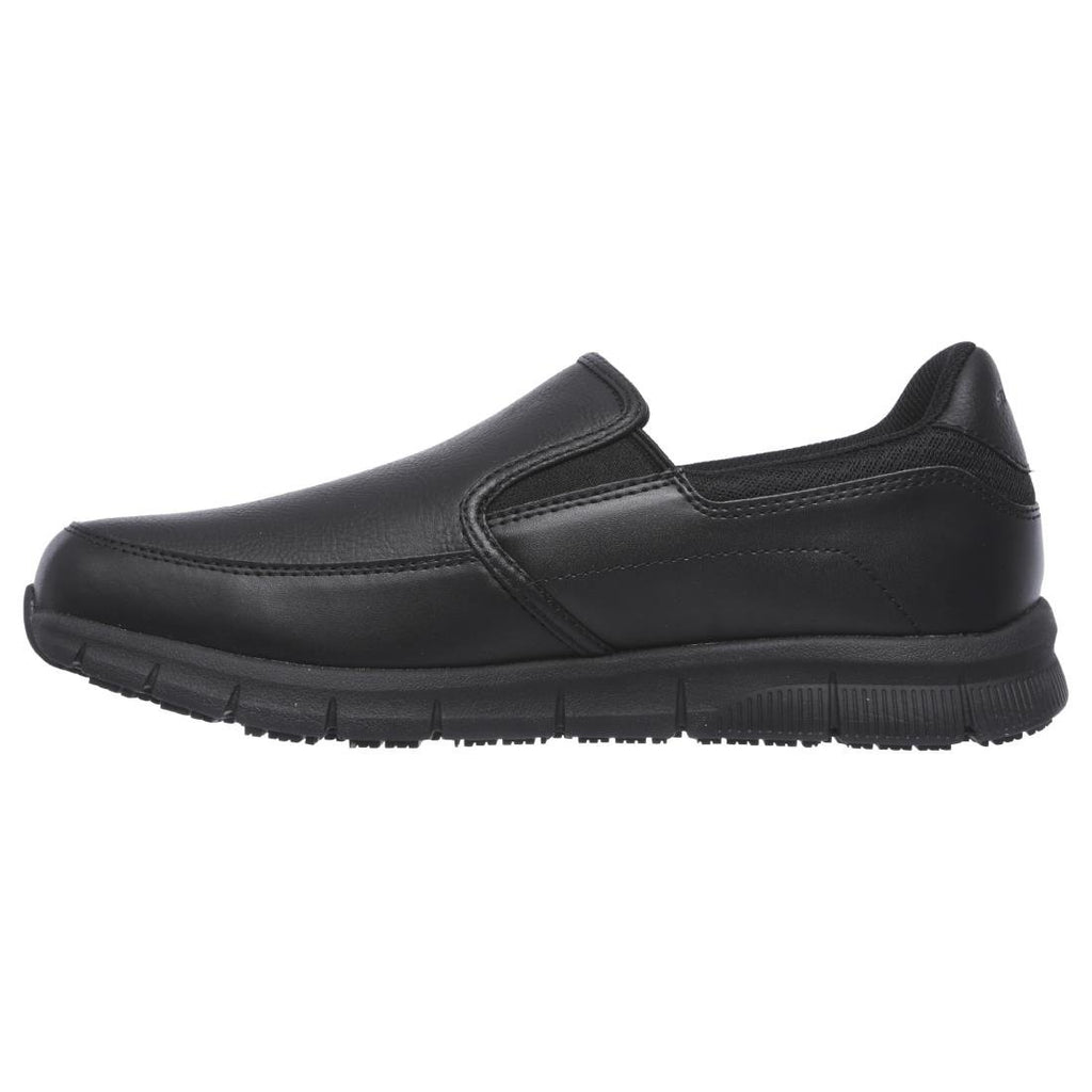 Arbeiten Sie intelligenter und bequemer mit dem Skechers Work Relaxed Fit(R): Nampa - Groton SR Schuh. Sportlicher, bequemer, rutschfester Slip-on-Sneaker zum Hineinschlüpfen mit Obermaterial aus glattem Synthetikleder mit Lederstruktur, Ziernähten und Memory Foam-Einlegesohle.