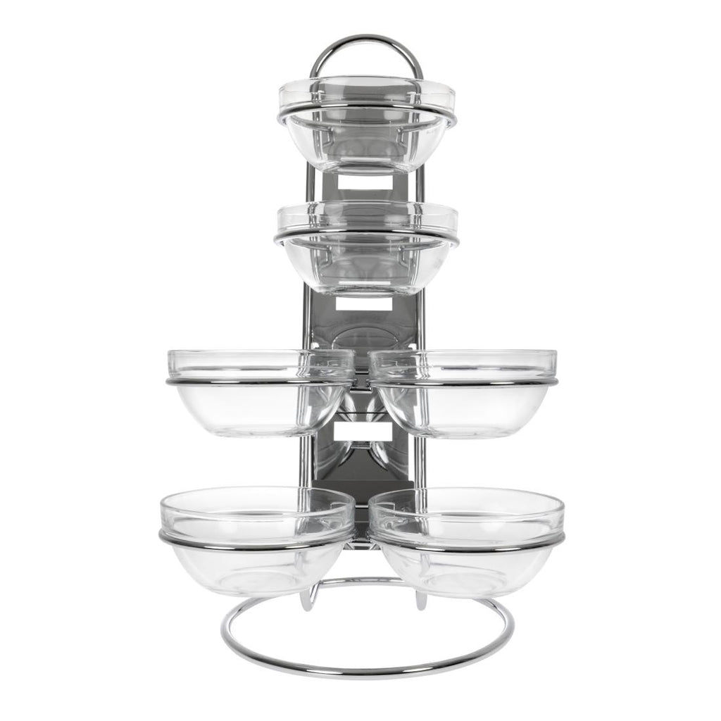 Verchromte Buffetleitern mit Glasschüsseln. Leitersets werden mit sechs Schüsseln, zwei Einzelschüsselringen und zwei Doppelschüsselringen geliefert (Ersatzteile und Polycarbonatabdeckungen sind separat erhältlich). Ideal für den Buffetgebrauch.