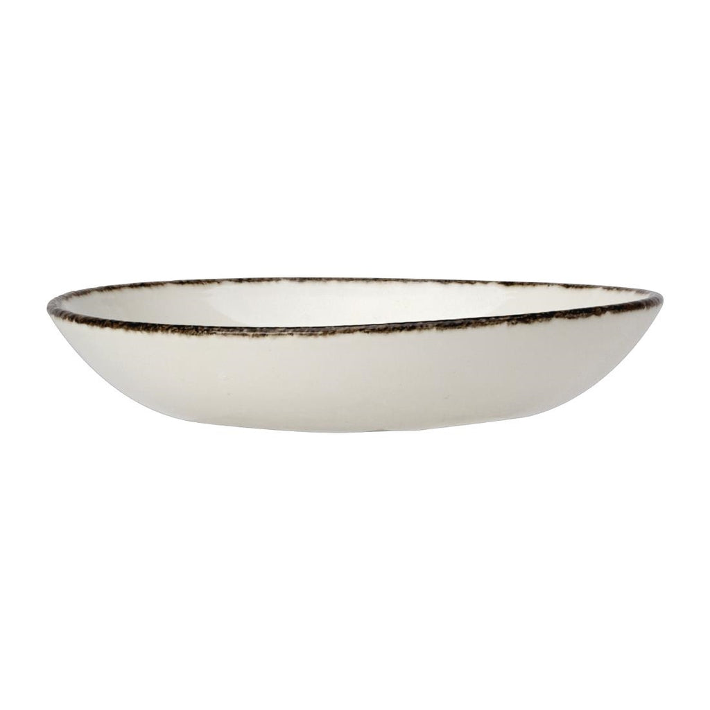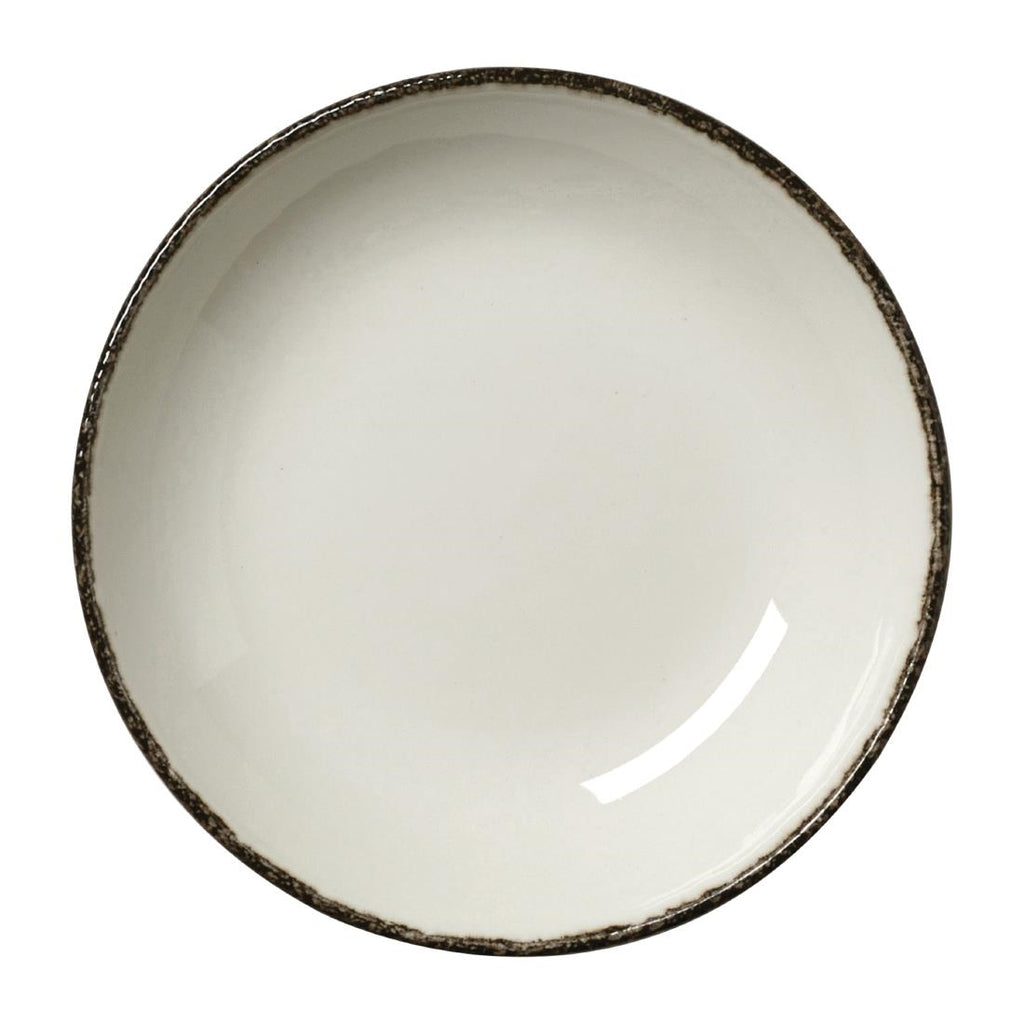 Mit Aluminiumoxid angereichertes Weißgeschirr mit einem auffälligen, reaktiv glasierten Rand, der von Stück zu Stück unterschiedlich ist. Ideal, um Ihren Gerichten eine rustikale Note zu verleihen, ohne auf die traditionelle, elegante Ausstrahlung von Weißgeschirr zu verzichten. Mikrowellen-, gefrierschrank- und spülmaschinenfest.