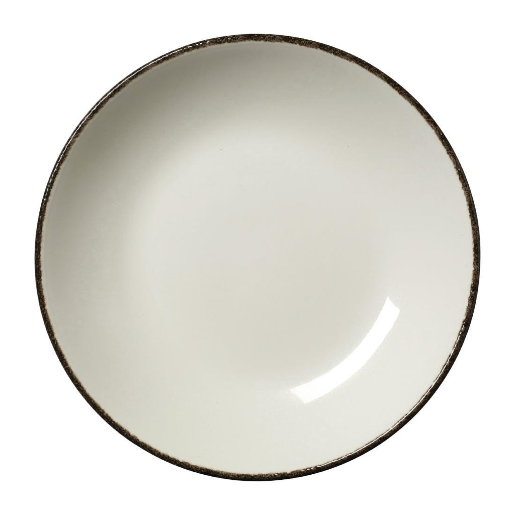 Mit Aluminiumoxid angereichertes Weißgeschirr mit einem auffälligen, reaktiv glasierten Rand, der von Stück zu Stück unterschiedlich ist. Ideal, um Ihren Gerichten eine rustikale Note zu verleihen, ohne auf die traditionelle, elegante Ausstrahlung von Weißgeschirr zu verzichten. Mikrowellen-, gefrierschrank- und spülmaschinenfest.
