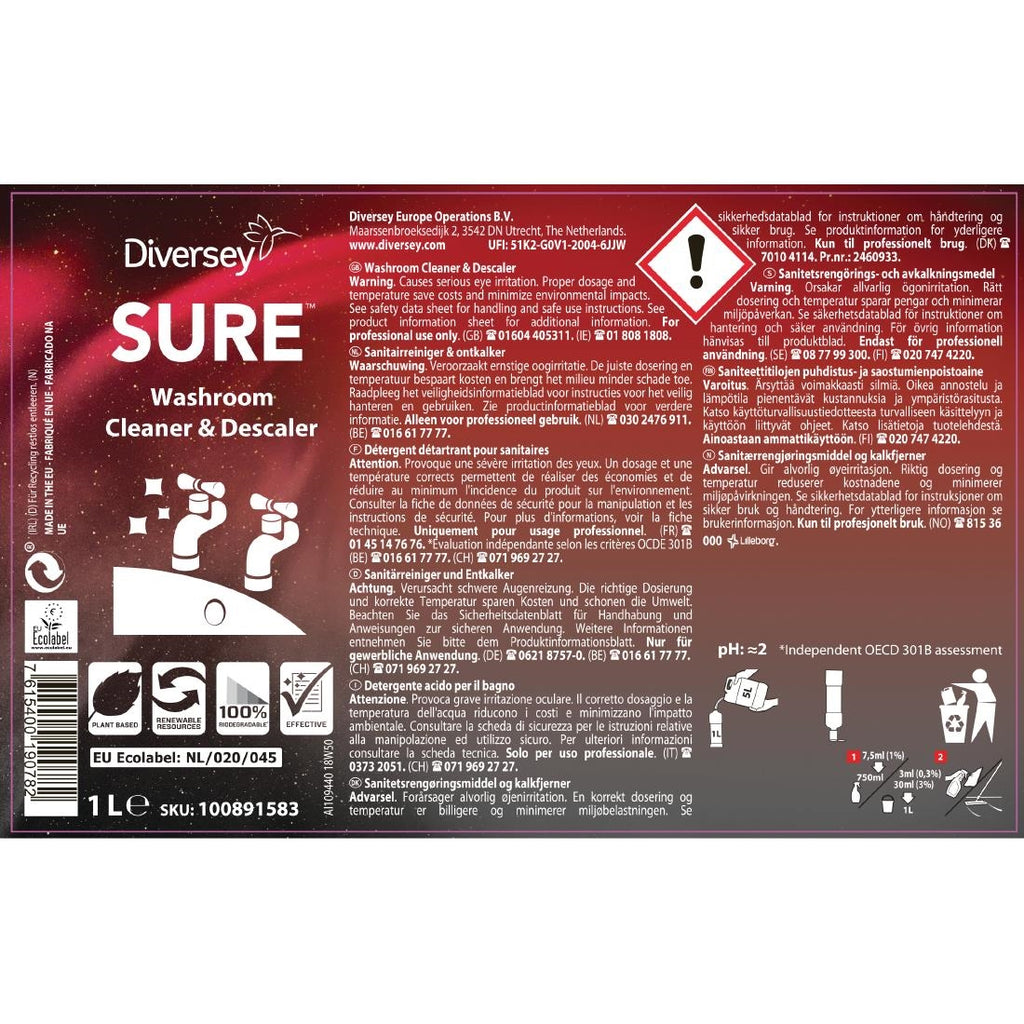 Reinigen Sie Ihre Waschraumoberflächen effektiv, nachhaltig und sicher mit dieser 1-Liter-Flasche Diversey SURE Waschraumreiniger- und Entkalkerkonzentrat. Dieser Reiniger und Entkalker besteht vollständig aus erneuerbaren, pflanzlichen Inhaltsstoffen, enthält also keine gefährlichen Inhaltsstoffe und ist zu 100 % biologisch abbaubar. Daher schadet es der Umwelt nicht, da es zerfällt, und stellt sicher, dass Ihre Mitarbeiter bei der Reinigung vor potenziell schädlichen Substanzen geschützt sind.