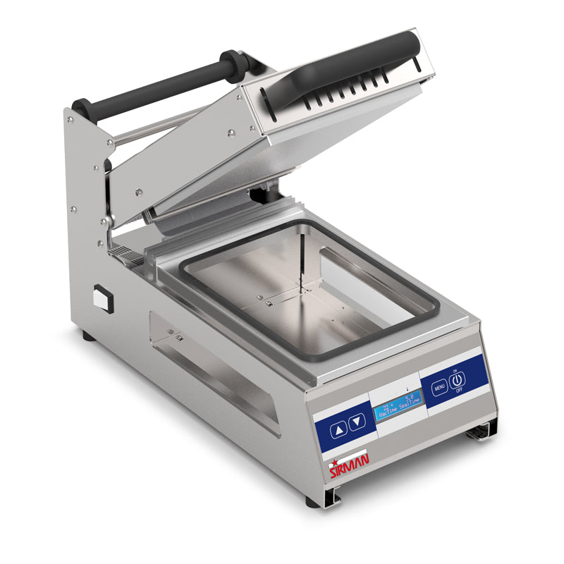 Praktischer und robuster manueller Schalenversiegler.; Gehäuse aus Edelstahl 304.; Elektronische Steuerung mit Temperatur- und Vorheizsteuerung.; Anzahl der Tabletts.; Siegelzeit 4 Sekunden.; Teflonbeschichtete Aluminium-Dichtungsplatte; 260 x 190 mm (max. Fach)