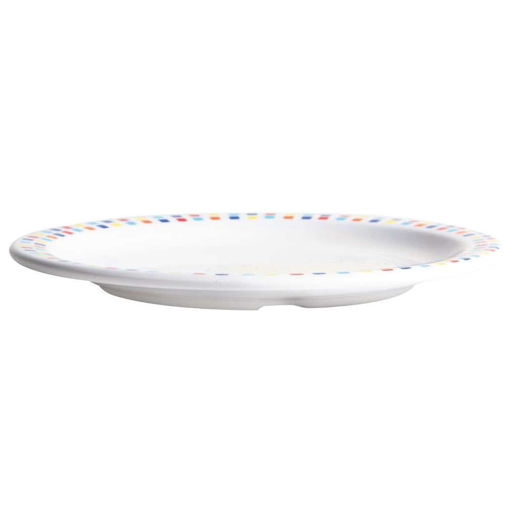 Melamin ist ein starker, leichter und harter duroplastischer Kunststoff, der eine ideale hygienische und langlebige Alternative zu Porzellan darstellt. Diese Speiseteller von Carlisle haben einen weißen Teller mit einem mehrfarbigen Mosaikeffekt am Rand; Sie eignen sich perfekt für die harten Anforderungen des täglichen Einsatzes in Schulen, Krankenhäusern und Pflegeheimen.