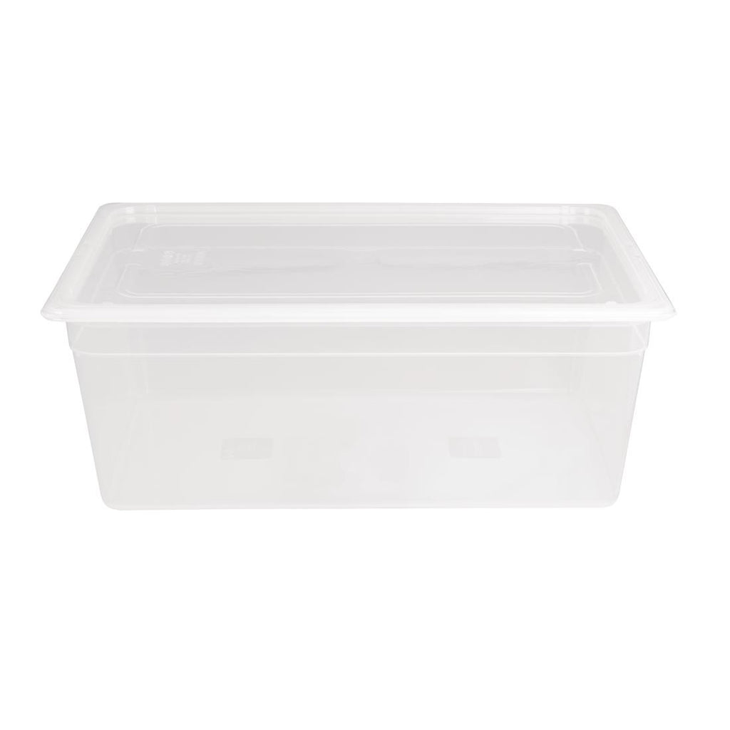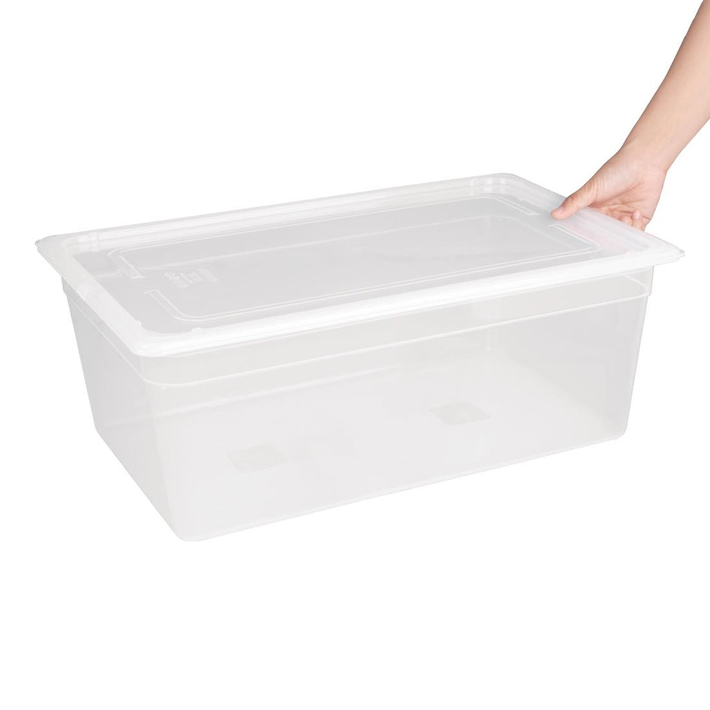 Bewahren Sie eine Vielzahl von Lebensmitteln sicher auf mit diesem Vogue 1/1 Gastronormbehälter mit Deckel (25,6 l/200 mm).