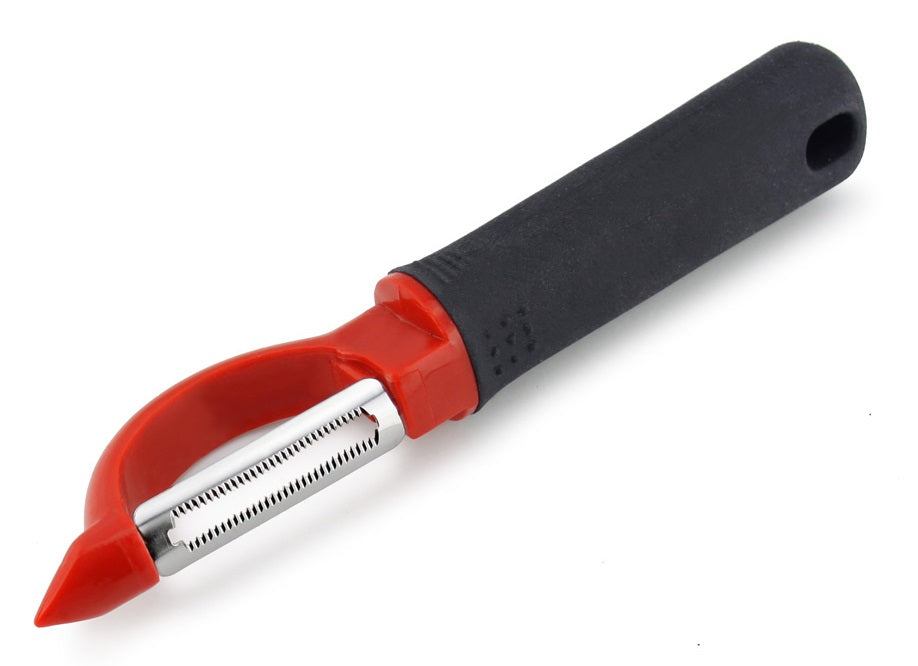 Introducing the Chef Set 7.5'' Peeler, an essential tool for any kitchen that transforms the task of peeling vegetables into a swift and efficient process. Designed with a swiveling blade, this peeler effortlessly adapts to the contours of your fruits and vegetables, allowing for quick and practical preparation with minimal mess. It is ideal for handling common kitchen staples such as carrots and potatoes, and features a dedicated eyer to tackle those pesky potato eyes and imperfections. The soft non-slip handle ensures a comfortable grip, making peeling a pain-free experience.