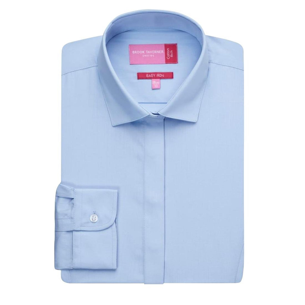 The Brook Taverner Palena blue shirt in size 12 is designed for optimal comfort and to maintain a professional look in any office, reception or hotel setting. Cut to perfection and tailored for ultimate sophistication, it is the perfect accompaniment to any suit jacket. Additionally, the cotton-rich material provides excellent comfort, durability and allows the shirt to breathe - keeping staff cool during busy periods of service.