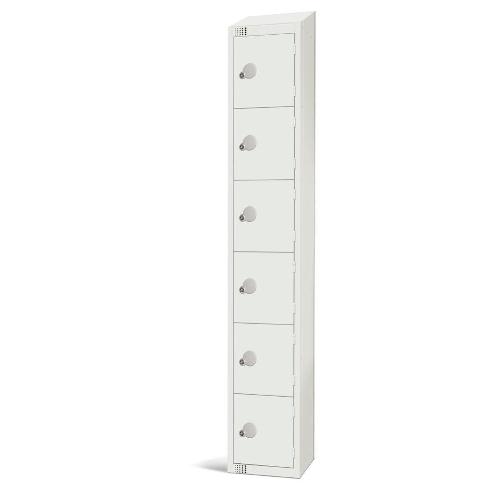 This 6 door white locker from Elite benefits from a study welded steel frame and reinforced doors, adding excess strength and stability to the units. With an antibacterial coating which is effective against MRSA and E-Coli, these lockers are perfect for schools, gyms and leisure facilities with such hygienic properties. Pre-drilled holes in the back of the lockers ensure that they can be fixed to the wall, to save space and minimise movement even when exposed to rigours of everyday like in busy commercial environments.
