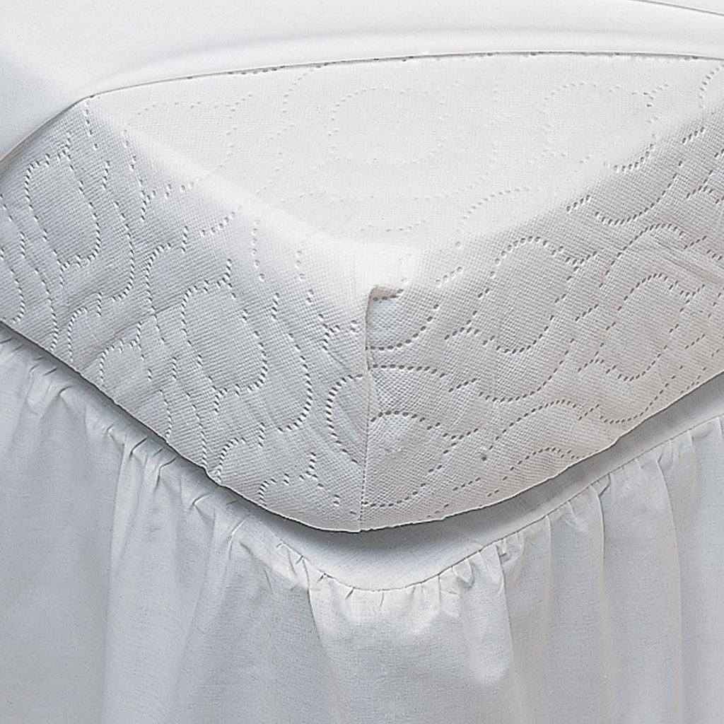Water resistant polypropylene mattress protector with PVC backing, quilted with a polyester filling. Attaches to the mattress via elastic straps at each corner. Filling: polyester. Fitting: elasticated bands. Cover: polypropylene, PVC backing. Weight: 265gm². Washing instructions: wash at 40° with reduced mechanical action. Do not iron. Do not wring. Do not bleach. Tumble dry on very low heat.