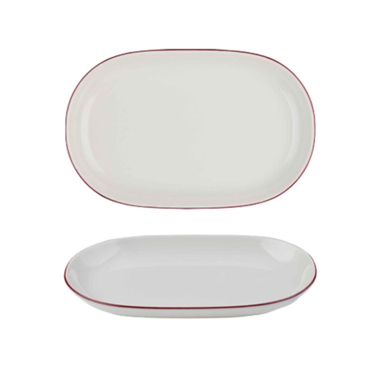 Serve sharing dishes and impressive presentations with the Modest Maroon Oval Platter, featuring a clean-lined design framed with a rich, distinctive maroon rim that provides an unparalleled backdrop, effortlessly enhancing any culinary creation. This substantial 33 x 21cm (13" x 8 ¼") platter combines contemporary style with commercial durability, offering ample space for large servings or artful arrangements. Its robust ceramic construction is built to withstand the demands of high-volume service. Ideal for buffets, sharing platters, and centrepiece dishes in hotels and restaurants.