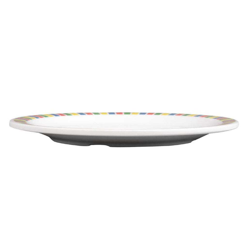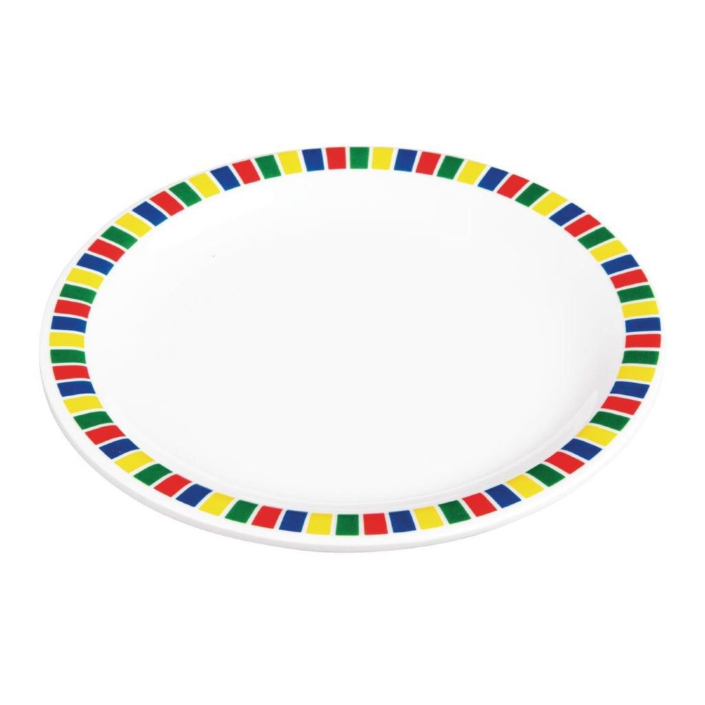 For a hygienic and durable alternative to china, our Olympia Kristallon melamine Fairground range plates are the perfect crockery for use in schools, nursing homes and other establishments. Melamine is a durable, scratch and chip resistant plastic which is lightweight, and this range has a colourful patterned rim.