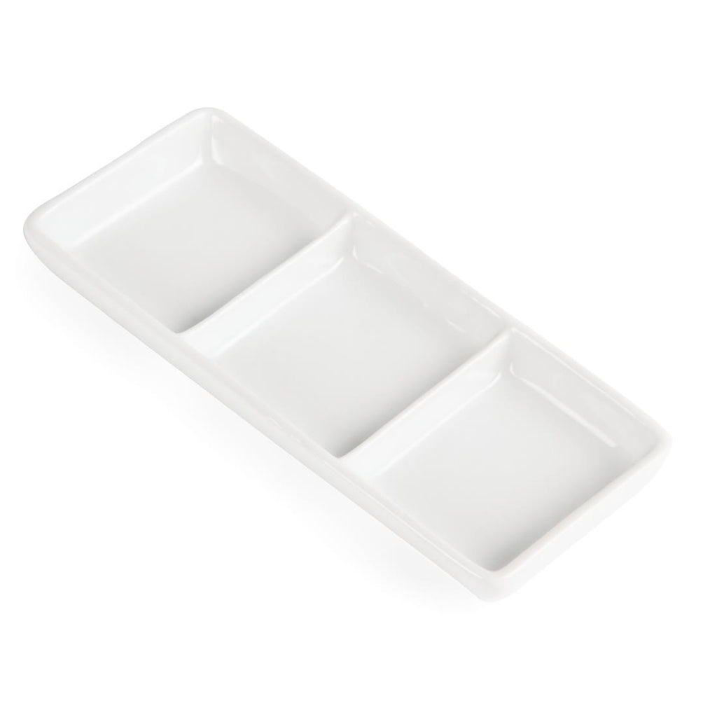 Great value pure white porcelain three section display dish for presenting food by Olympia, ideal for snacks and dips.