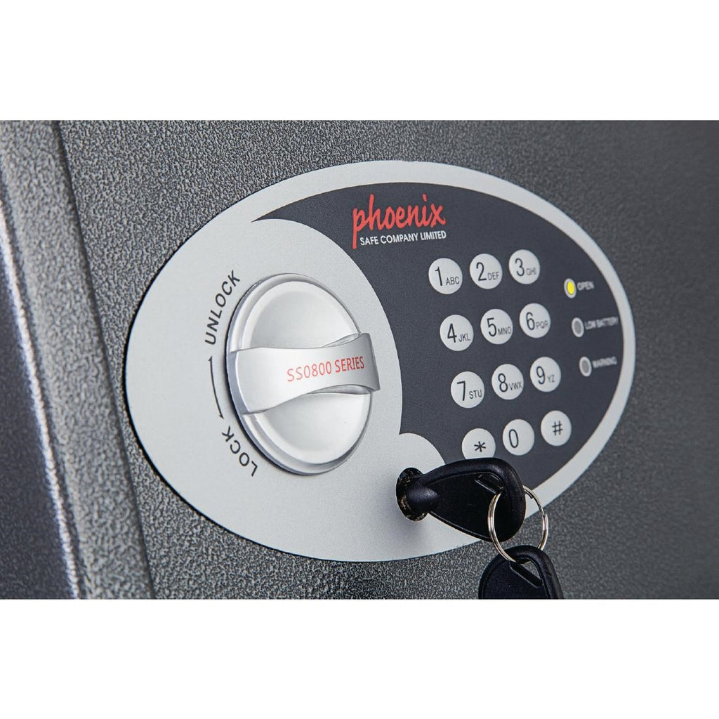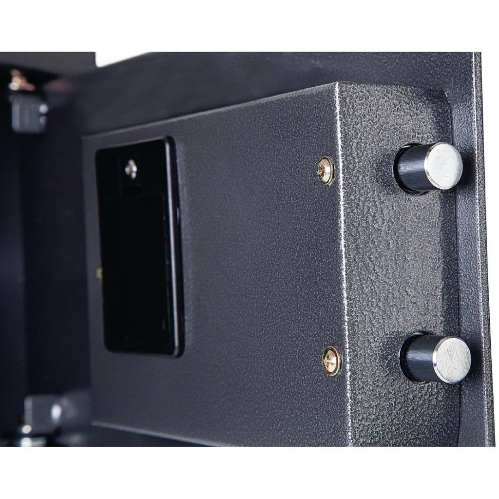 Equip your establishment with a secure location for any cash and valuables using this high quality 10 litre Phoenix Vela security safe. Built with a 4mm-thick steel door, anti-tamper system and concealed internal hinges, this safe is exceptionally strong and secure, helping to lower the risk of thefts in your premises. Boasting an intuitive electronic locking system, the safe is remarkably simple to operate and ideal for use in any hotel, enabling your guests to easily lock their goods away to ensure they have a relaxing and stress-free stay. Wall and base fixing holes also allow the unit to be fitted onto any brick walls or concrete floors, helping to prevent the theft of the safe itself. Completed with an interior LED light, the safe will illuminate when opened, allowing you to quickly identify and obtain your valuables in even the darkest of rooms. Requires 4 x AA batteries.