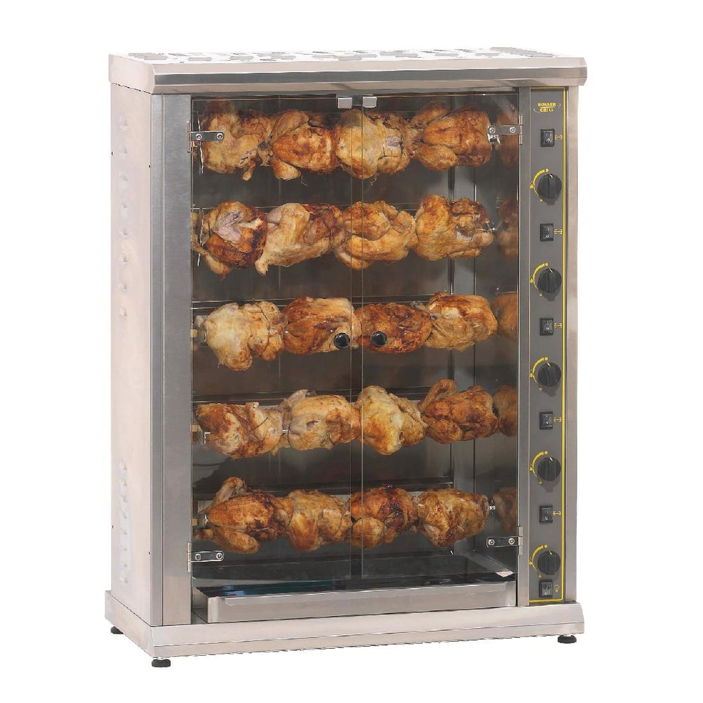 Roller Grill rotisserie is easy to clean and simple to operate making it ideal for front of house use. With infrared quartz technology and an independent spit control, it also features an optional wheeled stand and clamp spit for chicken wings and drumsticks. There is plenty of room to hold up to 20 chickens.