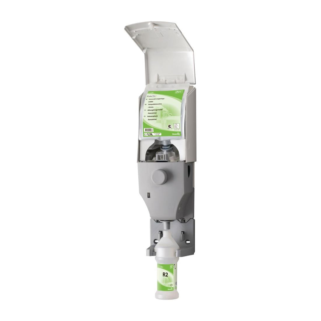 Empty refill bottles for the Diversey Room Care R2 multi-surface cleaner and disinfectant chemical. Colour-coded for easy identification.