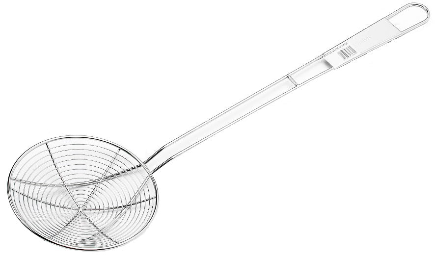 Introducing the Round Skimmer from Chef Set, a quintessential kitchen tool designed to enhance your frying experience. Constructed from high-quality stainless steel, this skimmer features a reinforced wire web mesh that effectively captures food items while allowing excess oil and residues to drain away seamlessly. Its long handle ensures that your hands remain at a safe distance from hot oil, providing peace of mind during culinary tasks. Whether you are shallow frying crispy vegetables or deep frying succulent meats, this versatile skimmer is a reliable companion in the kitchen. Additionally, the convenient loop at the end of the handle allows for effortless hanging storage, making it an ideal kitchen accessory for convenience and efficiency.