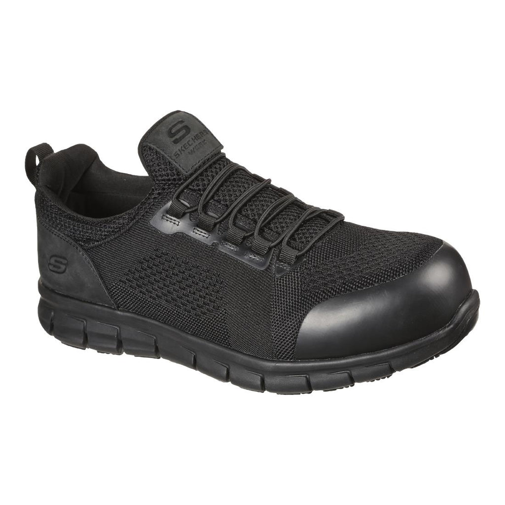 Get right to the comfort and protection with the Skechers Work: Synergy - Omat Alloy Toe shoe. Soft smooth woven mesh fabric and smooth synthetic upper in a slip on stretch laced sporty casual slip resistant alloy safety toe work sneaker with stitching and overlay accents with Skechers ESD insole.