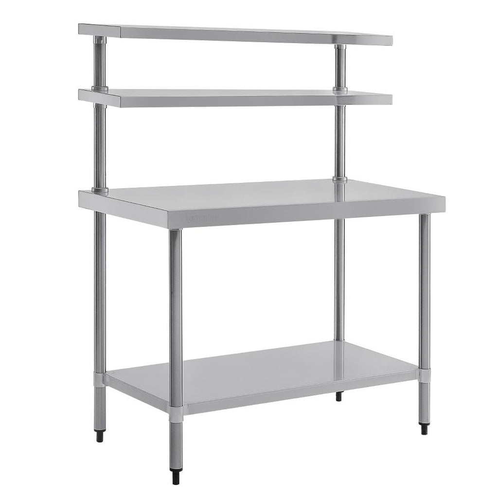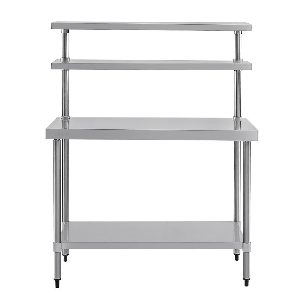 High quality polished finish stainless steel units with two gantry shelves providing maximum storage space above worktops and galvanised undershelf.